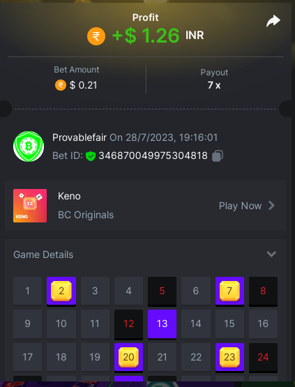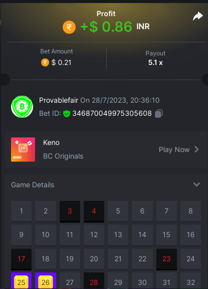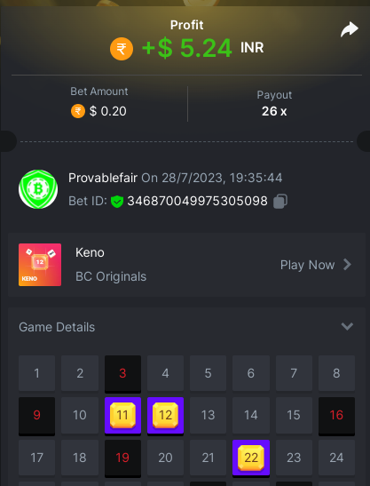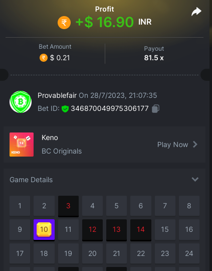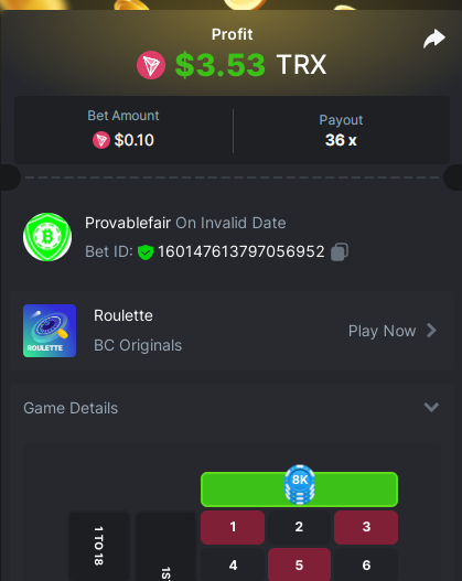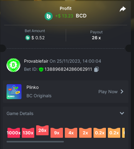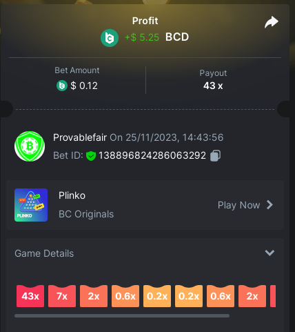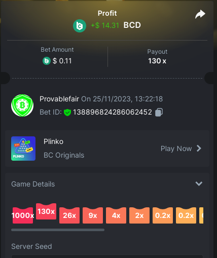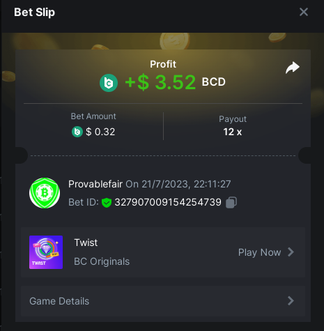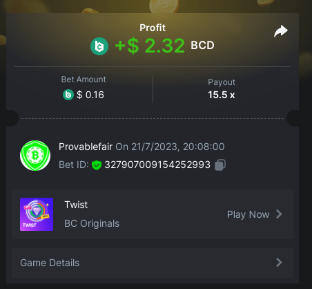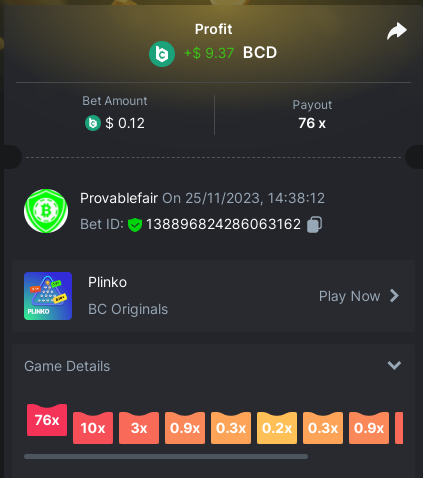 9x 0.32 https://bc.game/#/sd/11EBVJLUGH5GCZ Bet ID:327907009154254740 ----- 12x 0.32$ https://bc.game/#/sd/11EBVNY5LHXTGN Bet ID:327907009154254739 -- 15.5x https://bc.game/#/sd/11EBNUJIV3VEXZ Bet ID: 327907009154252993 ---- 16.5x 0.32$ https://bc.game/#/sd/11EBVQRMJB3NRN Bet ID:327907009154254742 -