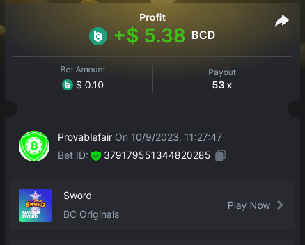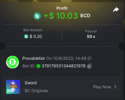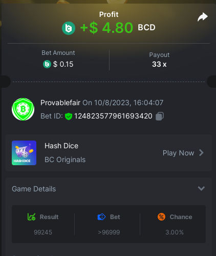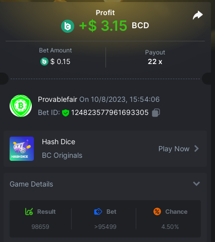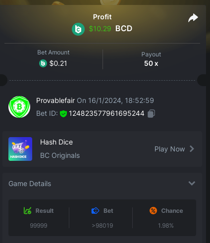 bet 0.21$ - 50x - Hash Dice - https://bc.game/#/sd/11QN6R5L1JDVQJ - Bet ID: 124823577961695244 bet 0.21$ - 50x - Limbo - https://bc.game/#/sd/11QN8527NJ49ZV - Bet ID: 82729660290963
