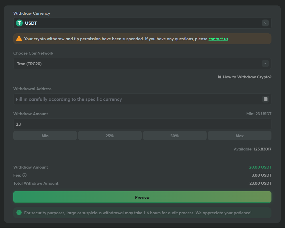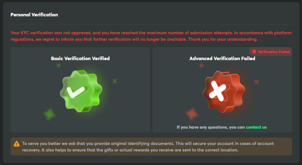 When I try to withdraw my money like I used to do, I had a notification that my crypto and tip permission has been suspended. When I'm reaching out to the support, they told me to do a Advanced KYC Verification. After some pictures, I got a notif that I have reached maximum number of submission attempts. And then after texting the supporters again, they told me to send an email to