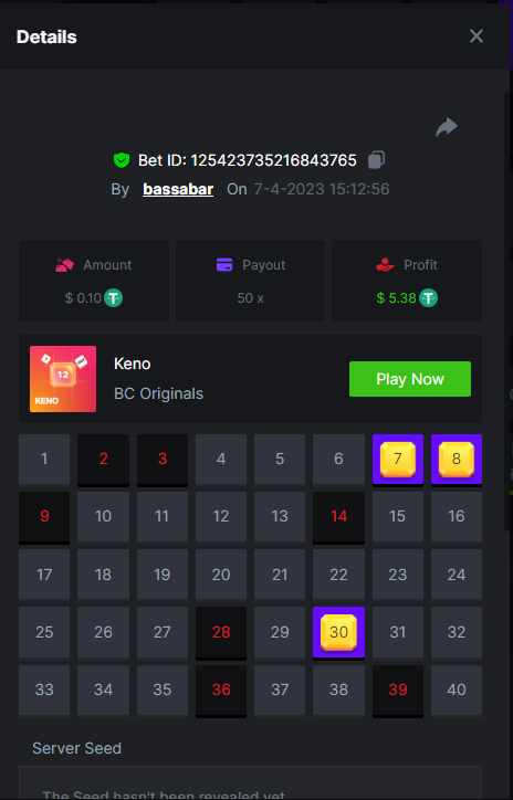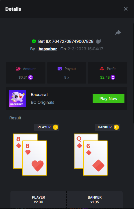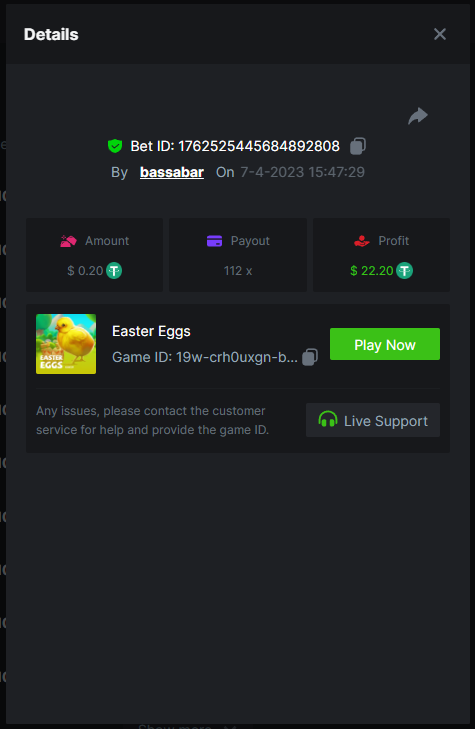 So it's just who place the highest bet on a single 12x win? Not consecutive wins or something? 12x https://bc.game/#/sd/114VKR7ICKMGPF Bounty (Tie, all red) https://bc.game/#/sd/114LUSQGPLD9G3