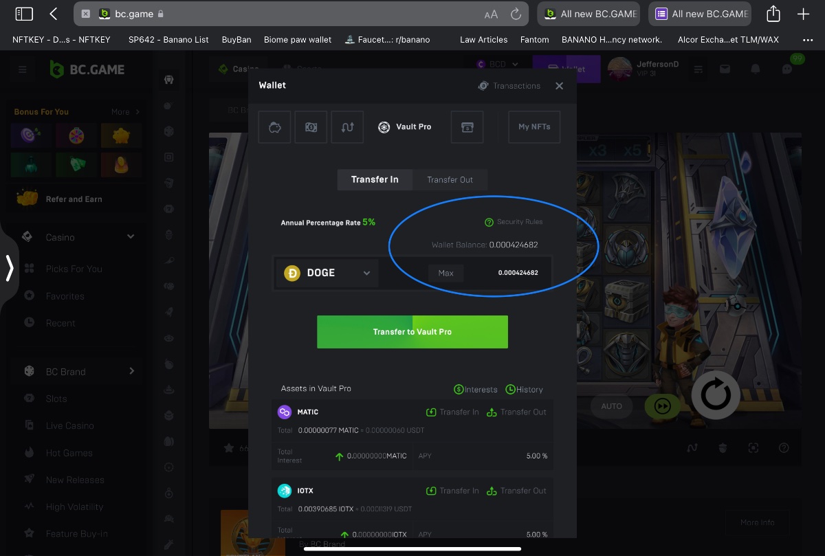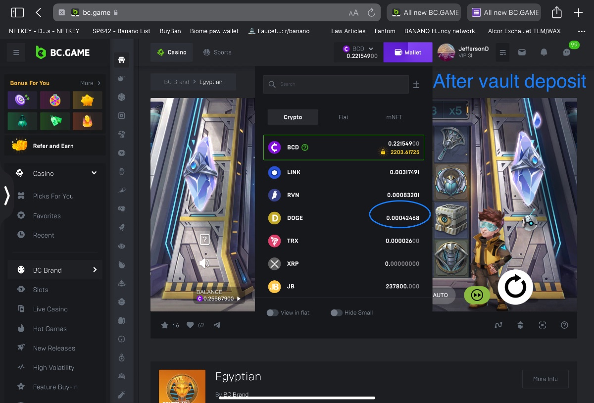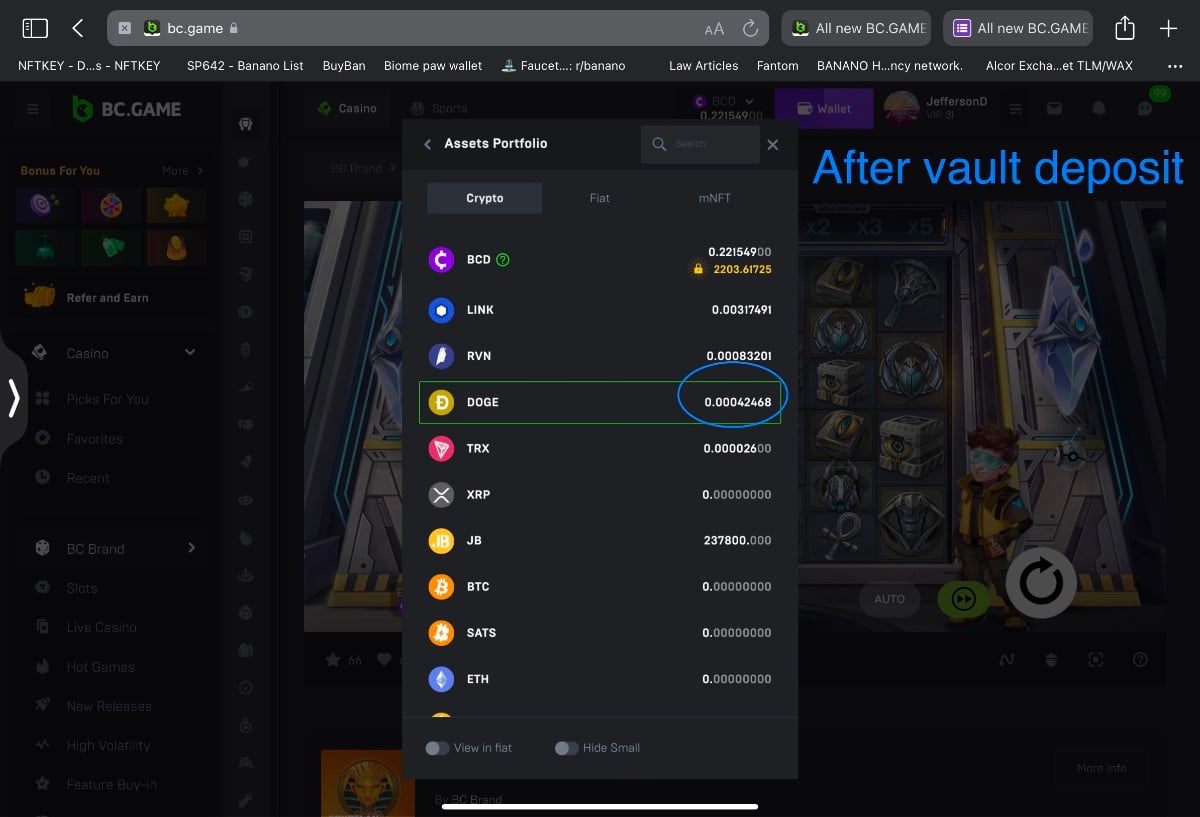 2. Unplayable dust decimal deposit into vault leaves the decimal balance stuck on player account balance until page is refreshed.