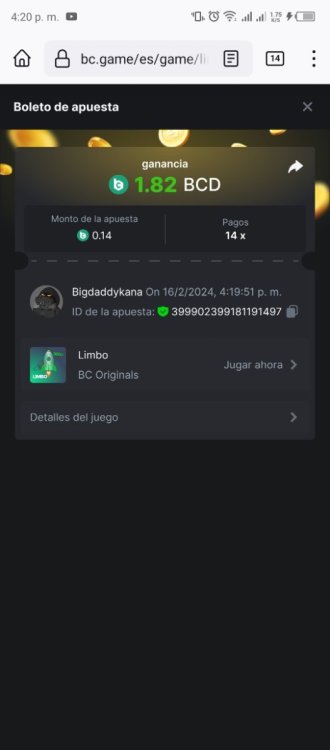 1. Medium Get a payout of 73.6x on the original Plinko game Risk-High, Row-10. https://bc.game/game-detail/1826943392161820961 Win a 96.96x Keno bet by selecting numbers 1, 14, 22, 28 (Risk: Medium). https://bc.game/game-detail/1827034824021283107 BC original Roulette Single game Win 36x on the on number 0. https://bc.game/game-detail/1827035766829926433 BC original Stellar Rush game Win 50x in the. https://bc.game/game-detail/1827073772802578467 HARD Limbo game is your target to win 200x or higher https://bc.game/game-detail/1826944288616437538 Plinko win 252x or higher in Row 14, High Risk https://bc.game/game-detail/1827028525647940642 Win on Wheel 48x or higher - Row 50, Segment High. https://bc.game/game-detail/1827030430100128802 BC Originals Slot Sea Of Olympus 1000 score a win 100x or higher. https://bc.game/game-detail/1827034006411754531 Get 200x or higher in the Hash Dice game. https://bc.game/game-detail/1827037167962733857 Easy Deposit at least $50 USD Win a payout of 20x on the original Limbo game. https://bc.game/game-detail/1826943828074409251 Get a 20x multi in the Arabian Secret slot game. https://bc.game/game-detail/1827029926712983074 Get a 30x multi in the Sugar Fiesta 1000 slot game. https://bc.game/game-detail/1827029023467372577 Follow BC.GAME on Instagram, take a screenshot, and share it with your IG username in the forum! Ig @kanaimacg