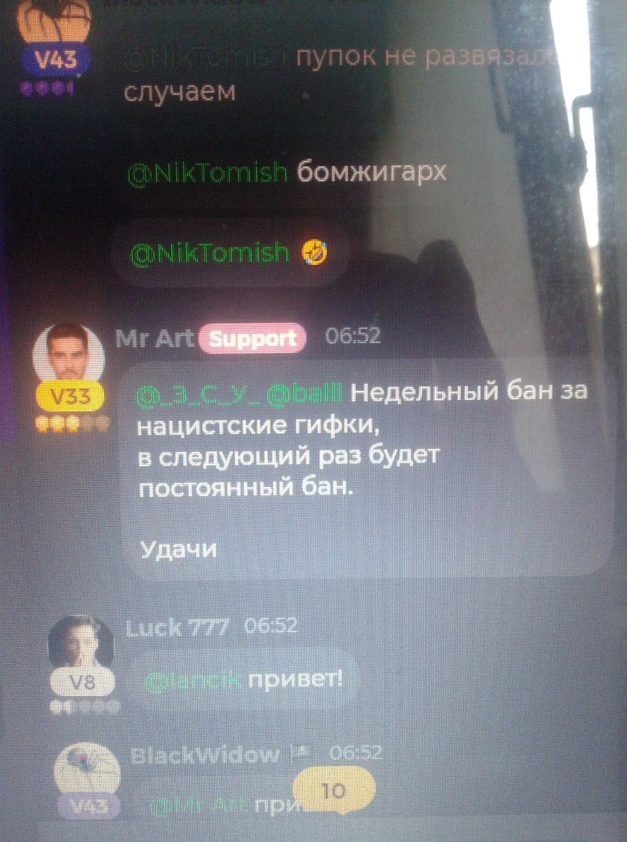 Я был заблокирован за размещение в чате нацистских гифок, которые были сделаны с самого казена. Он из России не стал блокировать своих друзей а из Украины дал мне бан!. Прошу вас решить этот вопрос!!!