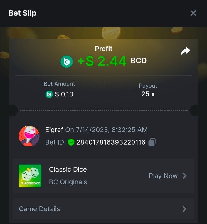 Eigref Posted July 13, 2023 Share Posted July 13, 2023 (edited) lol classic dice went on rigged mode today ate my 15$ hunting just 25x very frustrating, no wonder players before above me have not completed 4 payouts. https://bc.game/#/sd/11DSFPTVN17V2R https://bc.game/#/sd/11DSFSEW57LOGJ https://bc.game/#/sd/11DSI0FJUB94PF https://bc.game/#/sd/11DSITJXM1UJ9V https://bc.game/#/sd/11DSJ4U9OAKLXV https://bc.game/#/sd/11DSJGIBMQXA1F https://bc.game/#/sd/11DSJNQ5D613IR Now trying for another 11$ lolgood thing evoplay slots gave me profit 200x of 0.20$ =40$ Edited July 14, 2023 by Eigref Link to comment Share on other sites More sharing options...