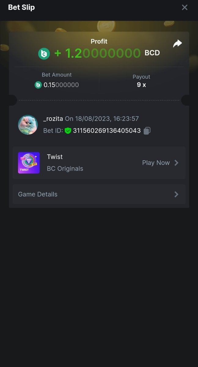 Admin BC_Jack Posted August 18, 2023 Admin Share Posted August 18, 2023 $5k Prestige TWIST Challenge #102 DURATION: 18th AUG - 25th AUG 12:30 pm UTC Greetings, honored VIPs! Prepare yourselves for the exhilarating ride offered by our latest game release, "Twist"! Dive into the thrill as you weave through its captivating twists and turns, with a chance to seize a share from our $5,000 prize pool. Adhere to the competition's rules and guidelines, and you might emerge as one of the fortunate victors. Strap in, as we lay out the guidelines for this exhilarating contest, guiding you towards the coveted top prize! What's the Challenge? Capture a multiplier - 9.0x or higher on the TWIST Game. Make sure you get your multiplier captured on my bets section. The highest multiplier will be considered. If a tie occurs in the multiplier, the next ranking player with the higher average bet amount (in USD) being the 2nd winner and so on. If there is a tie in the amount and multiplier, the one who posted or edited his post first will be considered in the Ranking. How to Enter To enter, copy the link of the bet you'd like to submit. Once you've copied it, paste it as a reply to this thread like so: Link: https://bc.game/#/sd/11EAIVFO99PS9Z In the same post, upload a screenshot of your win by clicking the game ID WITH VIEW IN USD mode ENABLED (accessible at the bottom of dropdown menu for your wallet up top. This way, we can ensure that your bet indeed met the minimum requirement at the time of placing it: Link: https://bc.game/#/sd/11EAIVFO99PS9Z Minimum VIP Minimum VIP 4 with phone verified will be eligible! Minimum Payouts Minimum payout to qualify is 9x Minimum Bet Size $0.15 USD equivalent Eligible Coins All cryptocurrencies are eligible (excepting JB) Available Prizes GENERAL TERMS Please combine all of your hits together in a SINGLE post. Edit your existing post for additional hits, don't create a new post. Each eligible entry must have the Bet Slip URL, failure to include it will disqualify participation in the event. Bet Slip image is not mandatory. Bets must be posted within 24 hours of placing bet in order to keep things fair for everyone. Bets must be made during the specified time window stated above. This thread will lock automatically when the time period is over. One (1) entry per household. Anyone found attempting to win multiple prizes will be disqualified from this challenge as well as all future challenges. Failure to follow instructions will result in your submission being null and void. By entering this challenge, you acknowledge that BC.Game has the final decision on results and placement. Payouts will be distributed after the event is finished. Please note that it could take anywhere between 24 hours to 7 days after the completion of the event. 6 Link to comment Share on other sites More sharing options...