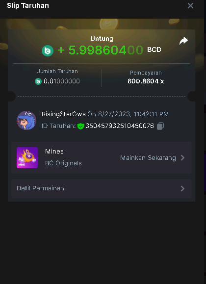 Moderator Giandreas Posted August 27, 2023 Moderator Share Posted August 27, 2023 Read Carefully Before Start To Hunt Forum Daily Challenges #340 Mines Hunt : mines Win the highest pay out Min Payout min 20x Min Level 4 ️Duration Starting : Now End time : 23.59 UTC Time How to Join? Make screenshot + paste your bet link + UID or Profile link Any coin, with min bet 0.01 USD is allowed (jb/bb/bcl not allowed) Reward Prizes 1st Place.....$7 BCD 2nd Place.....$5 BCD 3rd Place.....$4 BCD 4th Place.....$3 BCD 5th Place.....$2 BCD 🏵 Winners will be announcing next day after Roll Point! Link to comment Share on other sites More sharing options...