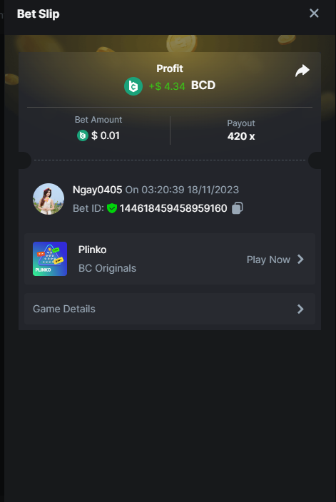 Moderator Giandreas Posted November 17, 2023 Moderator Share Posted November 17, 2023 Read Carefully Before Start To Hunt Forum Daily Challenges #421Hunt : Plinko Win the highest pay out Min Payout : 120x Min Level 4 ️Duration Starting : Now End time : 23.59 UTC Time How to Join? Make screenshot + paste your bet link + UID or Profile link Any coin, with min bet 0.01 USD is allowed (jb/bb/bcl not allowed) Reward Prizes 1st Place.....$7 BCD 2nd Place.....$5 BCD 3rd Place.....$4 BCD 4th Place.....$3 BCD 5th Place.....$2 BCD 🏵 Winners will be announcing next day after Roll Point! Link to comment Share on other sites More sharing options...