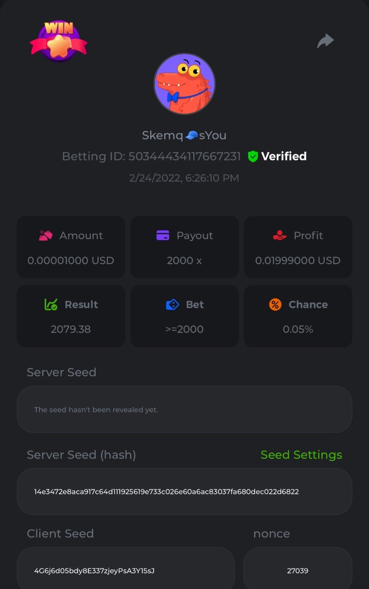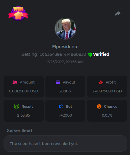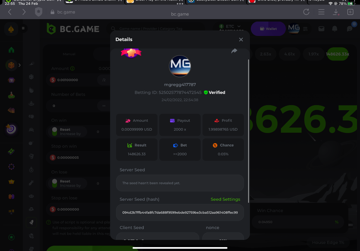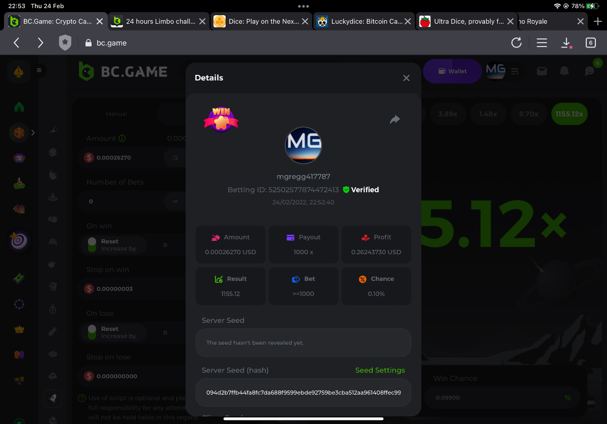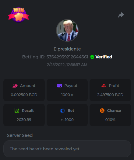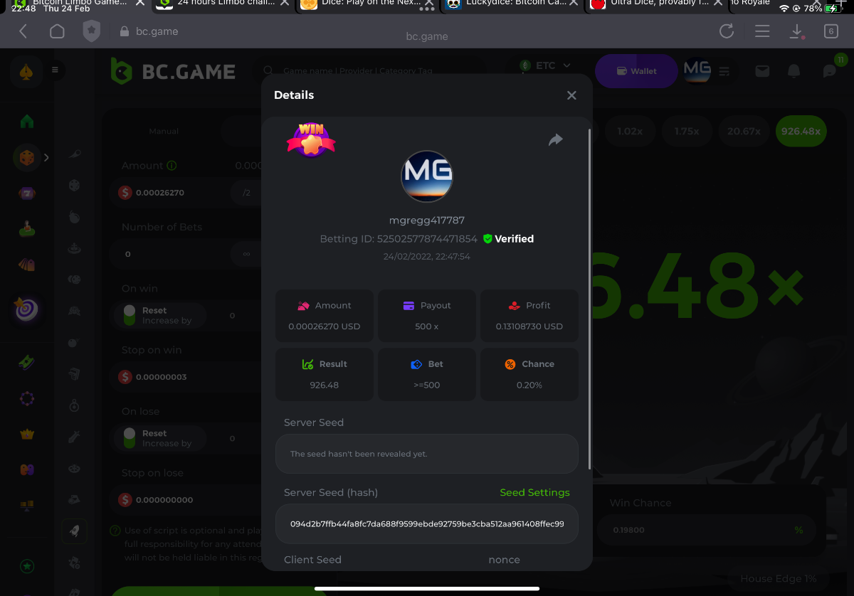 s0urce Posted February 23, 2022 Share Posted February 23, 2022 24 hours Limbo challenge! You have to hit as many multipliers as you can from this list: 500x - 1000x - 2000x - 4000x - 8000x - 16000x - 32000x - 64000x - 128000x - 256000x Players who match the most multipliers will receive a prize. Available Prizes 1st place... $25 2nd place... $12.5 3rd place... $7.5 4th-10th place... $2.5 Rules Don't post old bets Your bets must be a win In case of a tie, the player who wins the bet first will receive the prize. You have to post all the bets in 1 comment, if you want to add another bet, you have to edit your post. Failure to follow instructions will result in your submission being null and void. Requirements There is no minimum VIP level There is no minimum bet How to Enter To enter, copy the link of the bet you'd like to submit. Once you've copied it, paste it as a reply to this thread like so: Link: https://bc.game/sd/?sd=10EV9HVMAI07BN Below there's an illustrative image with more details. In the same post, upload a screenshot of your win by clicking the game ID WITH VIEW IN USD mode ENABLED (accessible at the bottom of dropdown menu for your wallet up top, and Submit Reply. Done! This way, we can ensure that your bet indeed met the minimum requirement at the time of placing it: Link to comment Share on other sites More sharing options...