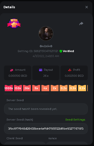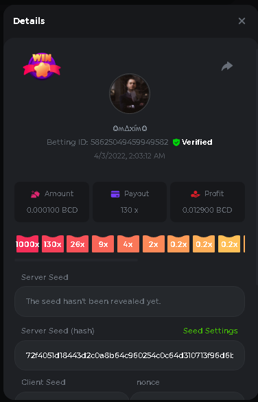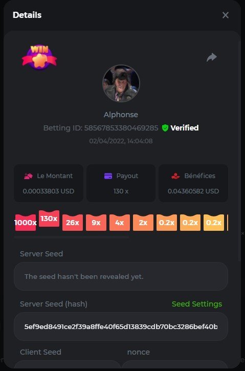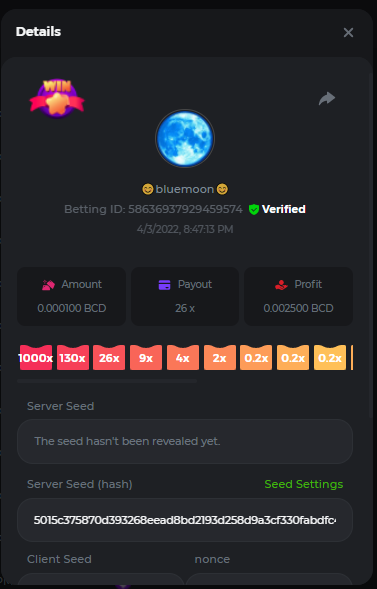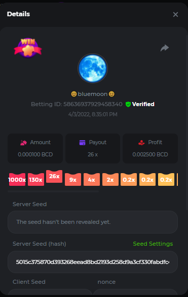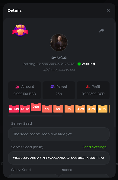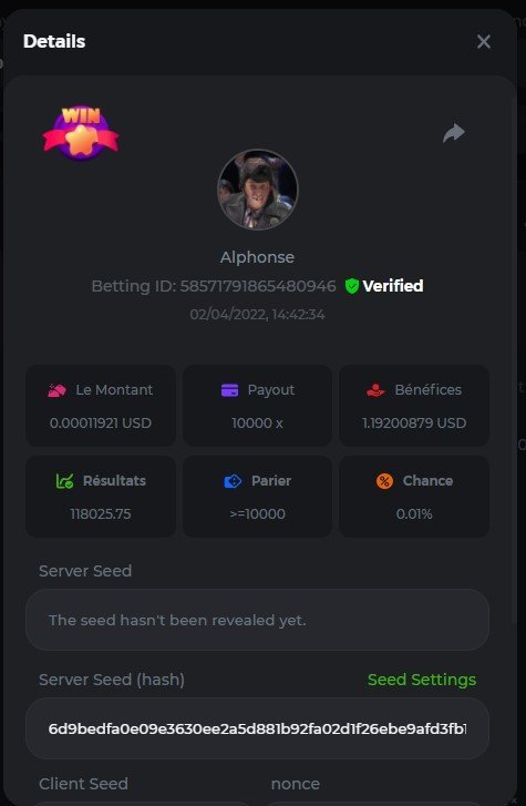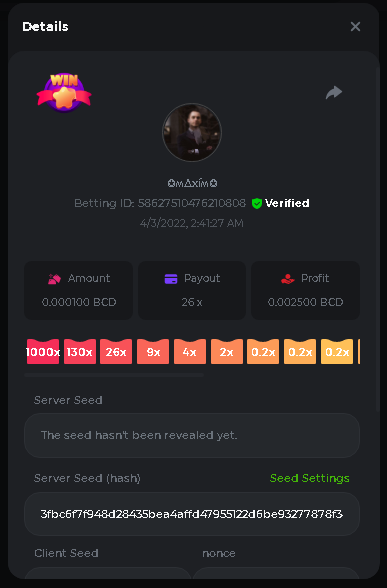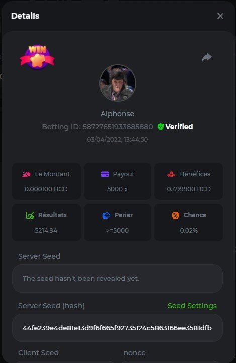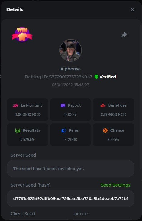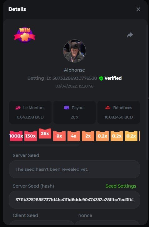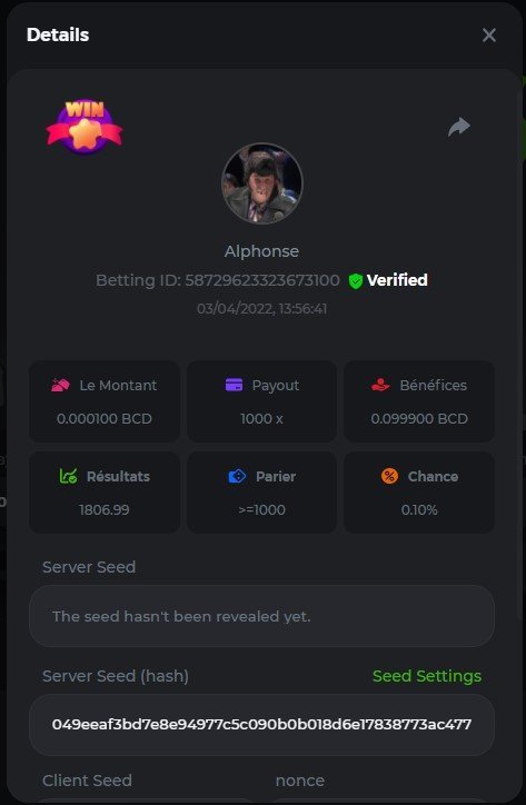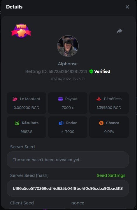 DIANA8800 Posted April 3, 2022 Share Posted April 3, 2022 On 4/2/2022 at 3:16 PM, Aksyen12 said: Bonjour à tous, c'est un challenge pour les joueurs de BC GAME en général. Soyez tous les bienvenus pour participer au concours du week-end !! Le principe est d'avoir le plus de points possible pour chaque joueur! Que le meilleur gagne, Bonne chance !! Hello everyone, this is a challenge for BC GAME players in general. Everyone is welcome to participate in the weekend contest!! The principle is to have as many points as possible for each player! May the best win, Good luck!! Jeux LIMBO et PLINKO : LIMBO : x1000 1point x2000 2points x5000 5points x7000 7points x10000 10pointsPLINKO : x26 1point x130 7points x1000 10points Réglementation : -Post the win link with the photo - Puste pour le week-end/for the weekend -Mise minimum de 0,0001 bcd / Minimum bet of 0.0001 bcd - N'importe quelle pièce autorisé sauf le JB/GB / Any part allowed except JB/GB - Tout niveau autorisé / All levels allowed 10 gagnants / 10 winners. PRIX/PRICE 62 BCD 1. 24 BCD 2. 16 BCD 3. 10 BCD 4 à 10 2 BCD ======= Bonne chance ======== Good luck!! Link to comment Share on other sites More sharing options...
