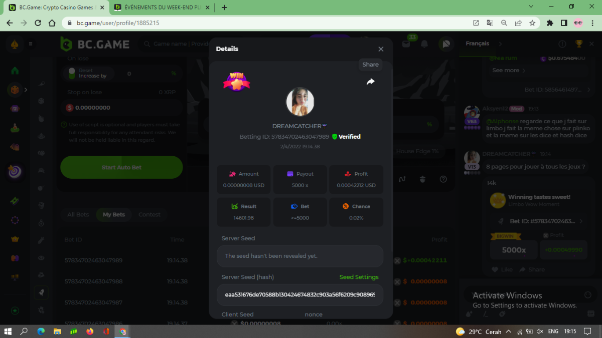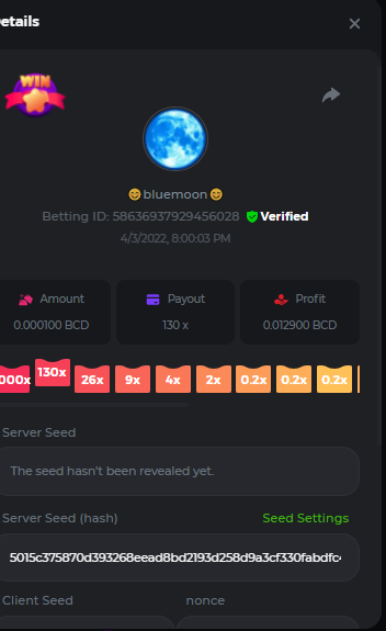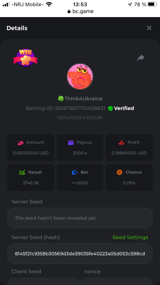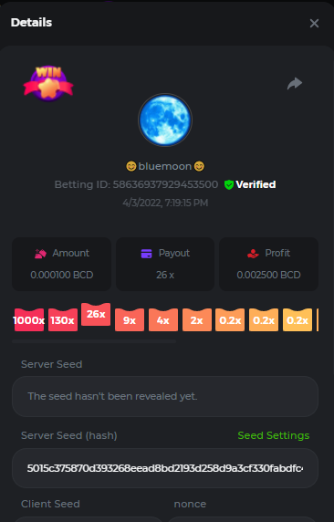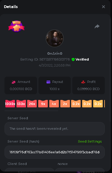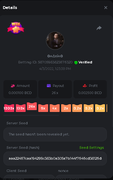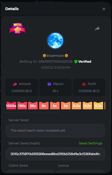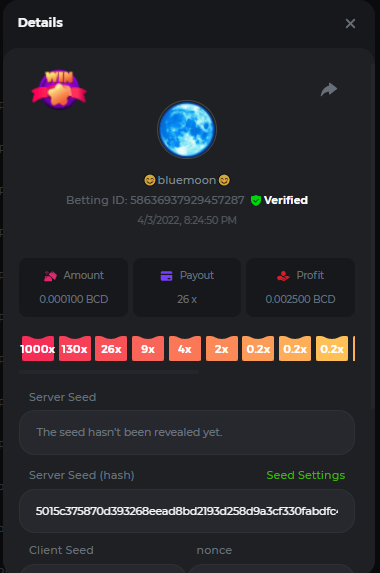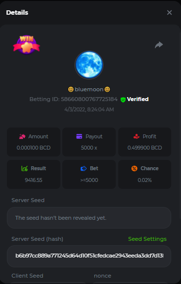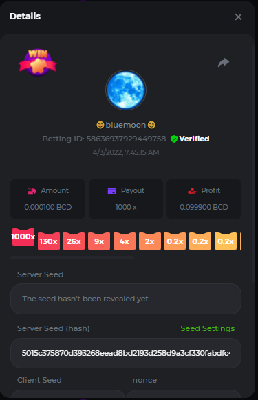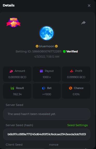 DIANA8800 Posted April 3, 2022 Share Posted April 3, 2022 On 4/2/2022 at 3:16 PM, Aksyen12 said: Bonjour à tous, c'est un challenge pour les joueurs de BC GAME en général. Soyez tous les bienvenus pour participer au concours du week-end !! Le principe est d'avoir le plus de points possible pour chaque joueur! Que le meilleur gagne, Bonne chance !! Hello everyone, this is a challenge for BC GAME players in general. Everyone is welcome to participate in the weekend contest!! The principle is to have as many points as possible for each player! May the best win, Good luck!! Jeux LIMBO et PLINKO : LIMBO : x1000 1point x2000 2points x5000 5points x7000 7points x10000 10pointsPLINKO : x26 1point x130 7points x1000 10points Réglementation : -Post the win link with the photo - Puste pour le week-end/for the weekend -Mise minimum de 0,0001 bcd / Minimum bet of 0.0001 bcd - N'importe quelle pièce autorisé sauf le JB/GB / Any part allowed except JB/GB - Tout niveau autorisé / All levels allowed 10 gagnants / 10 winners. PRIX/PRICE 62 BCD 1. 24 BCD 2. 16 BCD 3. 10 BCD 4 à 10 2 BCD ======= Bonne chance ======== Good luck!! Link to comment Share on other sites More sharing options...